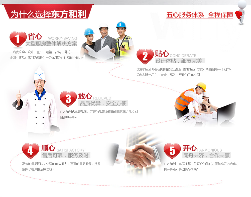 沈陽東方和利廚業有限公司,是一家業務覆蓋全國的廚房設備制造商及商用廚房系統集成服務商,致力于為廣大用戶提供高品質的廚房設備和完善的工程服務。 與傳統的"生產商"或"銷售商"不同,東方和利并不僅僅生產或銷售廚房設備,而是為客戶提供廚房整體解決方案的"服務商"。我們以客戶需求為中心,采用"五心"服務體系全程保障,為客戶提供廚房設計咨詢、設備生產、運輸、安裝、調試、培訓、售后等全套服務,讓您體驗到管家式服務的周到與便利。 東方和利憑借質量和服務優勢,在全國各大廚房工程招標中不斷中標,客戶涵蓋了單位食堂(企業、政府機關、部隊、學校、醫院)、星級酒店、餐飲、中央廚房、團膳配餐等多種類型。 我公司同時代理多種名牌食品機械、酒店用品,為客戶提供"一站式"商用廚具整體解決方案。我們秉承"質量第一,信譽至上"的原則,希望能在不久的將來為您提供優質的產品和服務!